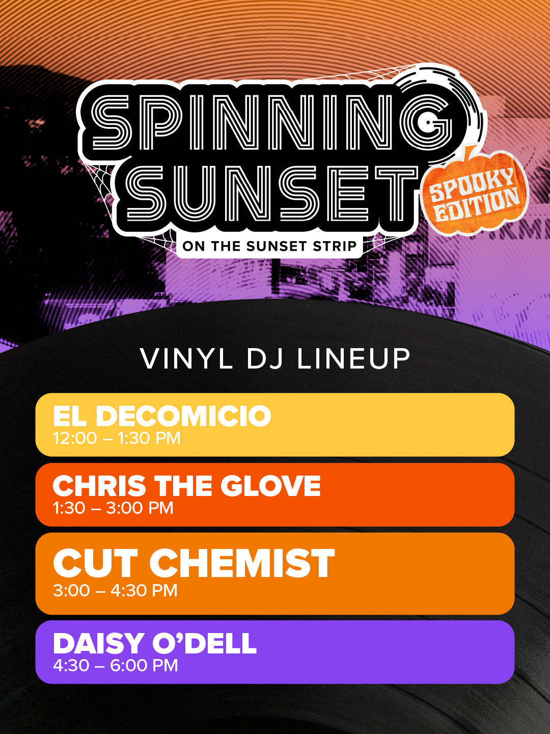 On October 25th from 12-6PM, we’re turning an ordinary parking lot on the Sunset Strip into a dynamic and spooky experience—the Spinning Sunset Vinyl Wax Fair – Spooky Edition.